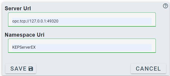 To configure a kepware connect you need the OPC UA address of the server. This can be found in the "OPC UA Configuration" utility installed with kepware. Ensure that the security is disabled as MVS does not currently support using certificates or SSL over OPC UA.