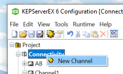 Siemens TCP/IP EthernetorAllen-Bradley Controllogics Ethernet. To add a new channel, right click onConnectivityand selectNew Channel. Select an appropriate channel type and follow the on screen prompts. The default values are usually sufficient.