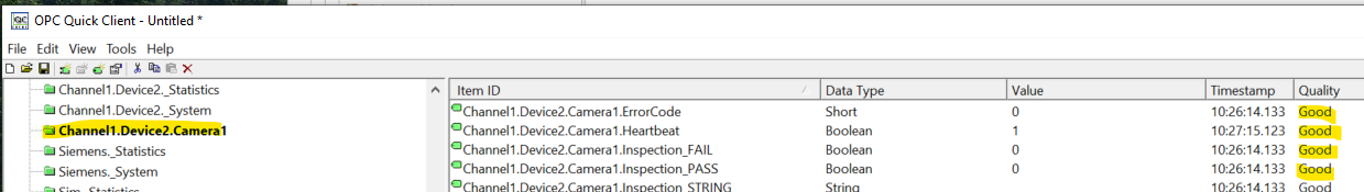 Select the configured Channel.Device.TagGroup from the list on the left and look at the Quality of each tag listed on the right. A "Good" quality indicates that there are no issues communicating with the PLC. "Bad" Quality indicates that there are issues reaching this memory address. This may be caused by numerous issues, from the address not exiting on the PLC to the PLC not being accessible over the network.