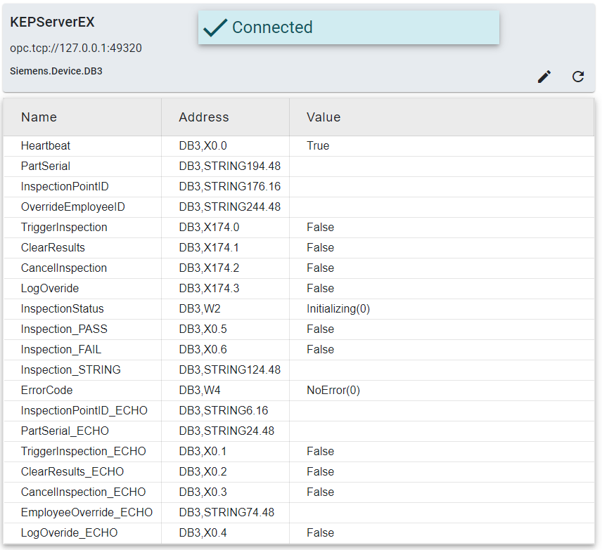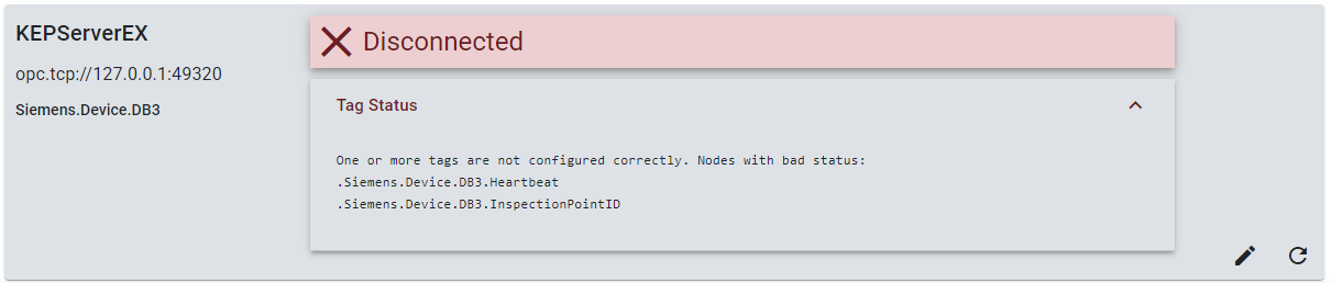In this example the PLC has not properly defined its memory addresses. The kepware Tag for the Heartbeat and InspectionPointId can't be found at the expected memory address. This can be fixed by updating the address on the PLC (recommended), but also by editing the address manually in kepware. Memory addresses are described in the docs on plc configuration.