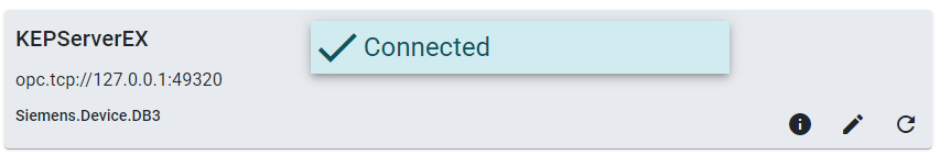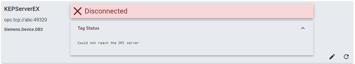In the next example MVS can't reach the OPC Server defined by the PLC Connection. This usually means that either the PLC Connection is not properly configured, kepware is not running, or its OPC UA connection is not accepting the MVS Server connection.