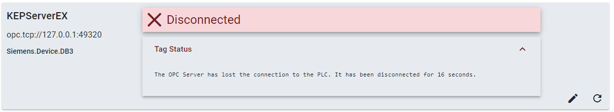 In the following image the Kepware OPC server has lost the connection to the PLC, which might indicate a networking issue: