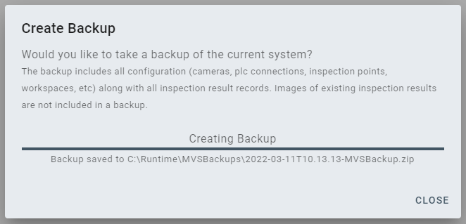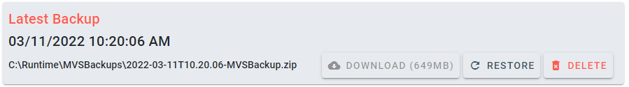 MVS Server supports the ability to take backups of the configuration data used for the system. This enables a user to create restore points for the system if anything ever needs to be recovered.