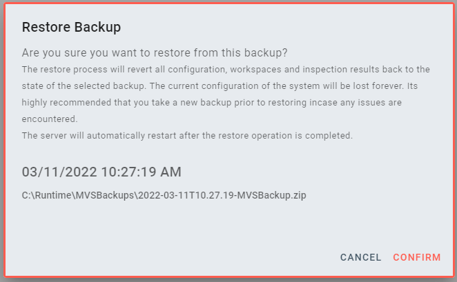 To restore from backup click on the Restore button for the desired backup. A dialog will open confirming the restore operation. Note: